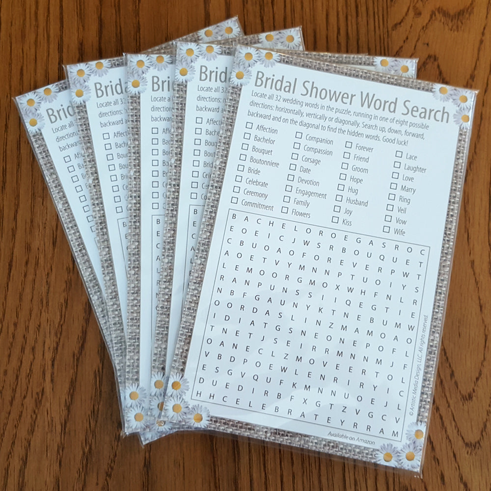 5.5" x 8.5" Bridal Shower Word Search Game Notepads (25 Sheets) - Burlap and Daisy Style - Premium Quality - Classic Design